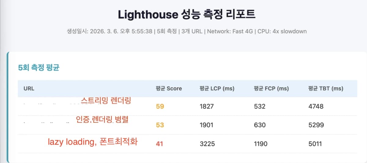 측정방식은 fast 4g, cpu slowdown 4x 환경에서 라이트하우스를 10회 측정 후 평균을 내었다가, 너무 오래걸려서 lighthouse api를 이용해서 수동측정을 자동화 했다.
